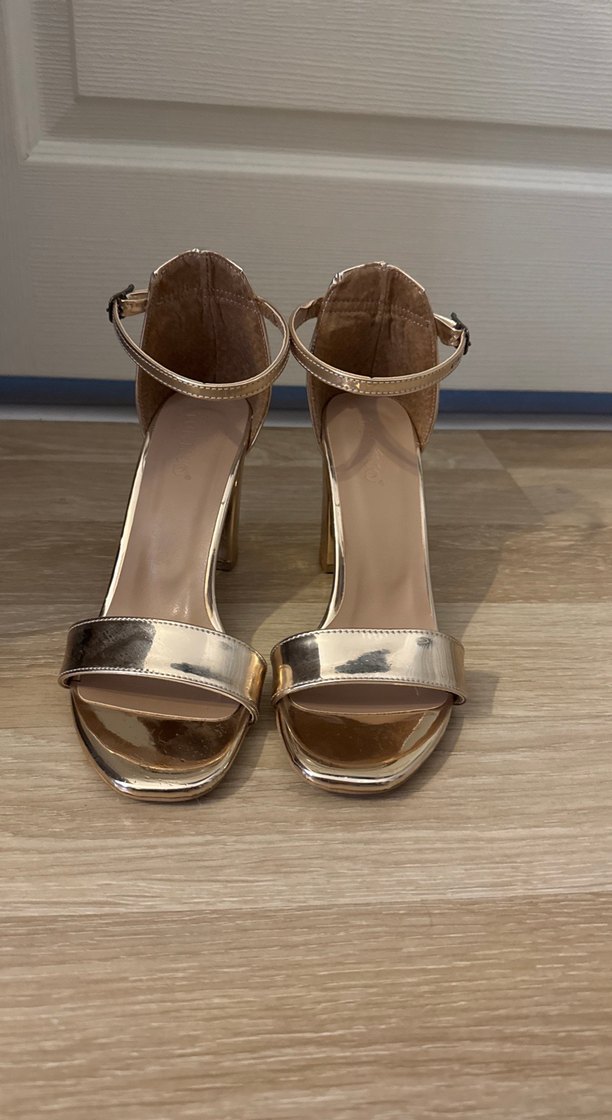 Altın renkli, parlak metal malzemeden yapılmış, tokalı ve ince topuklu minimalist kadın ayakkabısı, romantik akşamlar için uygun.