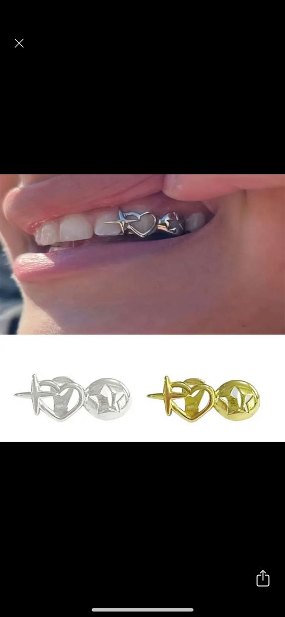 Kadınlar için tokalı tasarıma sahip, parlak altın renkli diş piercingi. Minimalist ve cesur karşı kültür tarzını yansıtır. ✨