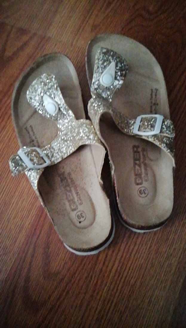 Altın renkli, tokalı ve kama topuklu kadın terlikleri. Parlak yüzeye ve kauçuk tabana sahip, vintage bohem tarzını yansıtıyor.