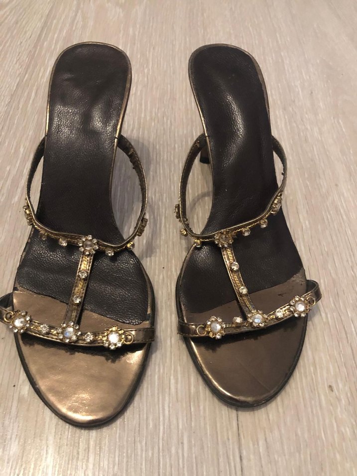 Altın renkli, tokalı stiletto topuklu kadın akşam terliği . Parlak yüzeyli ve desenli, romantik buluşmalar için uygun. Malzemesi kauçuk.