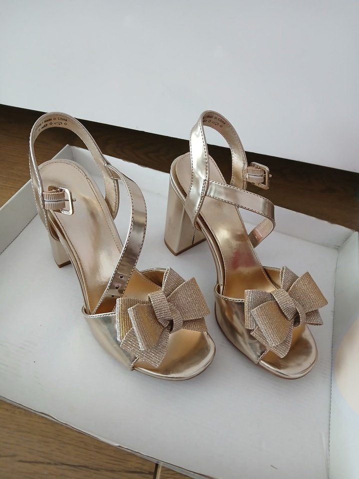 Altın parlak topuklu, tokalı kayış ve süslü fiyonk detaylı kadın abiye ayakkabı, düğünler için uygundur. Dayanıklı kauçuk malzemeden üretilmiştir. 37 numaradır.Yalnızca bir kere kuzenimin düğününde giyildi