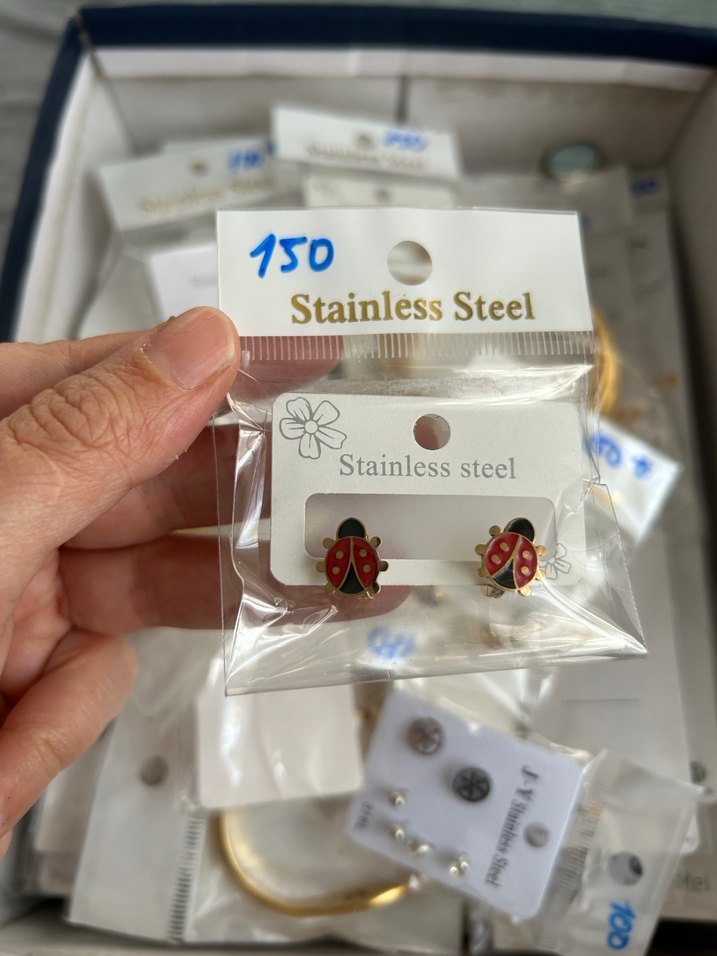 Altın renkli, paslanmaz çelikten yapılmış, renkli payetli uğur böceği desenli küpeler. Günlük sokak stili için midi uzunlukta ve baskılı desenlidir.