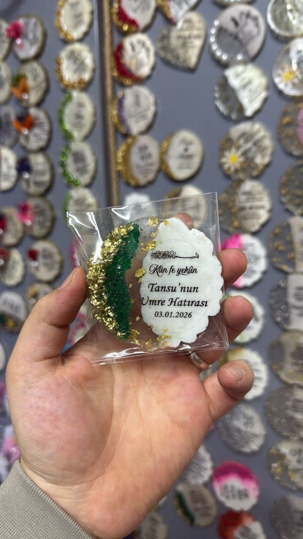 Altın ve yeşil detaylı, 03.01.2026 tarihli Tansu'nun Umre Hatırası olarak kişiselleştirilmiş parlak magnet