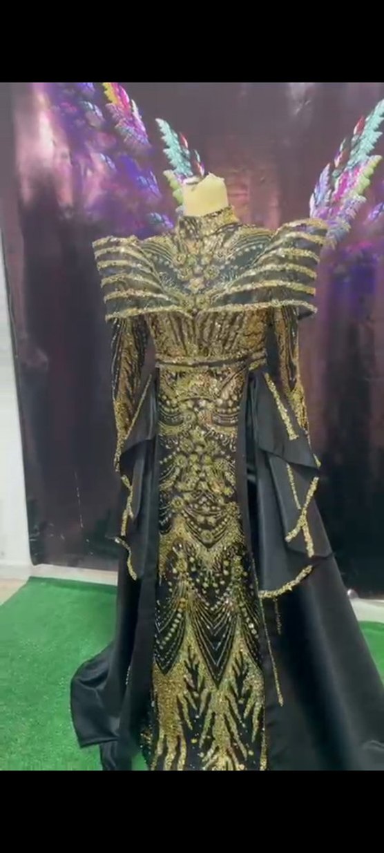 Yüksek yakalı ve uzun kollu, altın renkli uzun abiye elbise. Gotik tarzda desenli ve drapeli detaylarla avant-garde bir görünüm sunar. ✨Şal dahil 38.40.42.44 uyumlu arkası ipli sorun lütfen