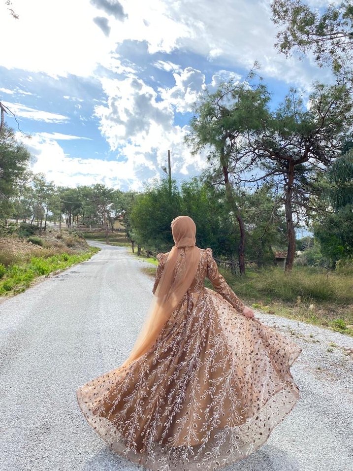 Altın renkli, uzun kollu, yüksek yakalı, etnik desenli ve drapeli bu abiye, modest ve gösterişli bir tarza sahiptir. ✨