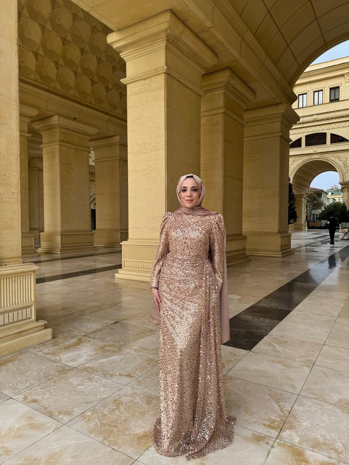 Altın Renkli Uzun Kollu Drapeli Abiye Elbise