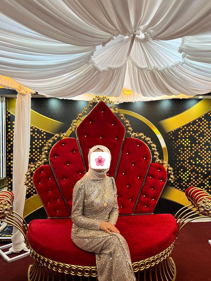 Yüksek yakalı, drapeli ve etnik desenli altın renkli, uzun, fitted henna elbise. Strappy kollu ve avangart tarzda, modest şıklık için uygun.
