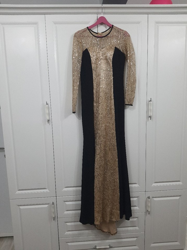 Uzun kollu, tekne yaka ve fit kesimli bu abiye elbise, altın payetler ve koyu yılan deseni ile süslenmiştir, düğünler için uygundur. ✨