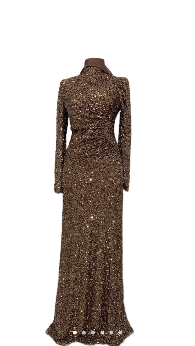 Uzun kollu, yüksek yakalı ve parlak altın payetlerle kaplı, klasik şıklıkta dar kesim abiye elbise. Şalı da gönderiyorum aynı renk