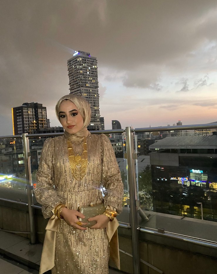 Altın Renkli Uzun Kollu Tesettür Abiye