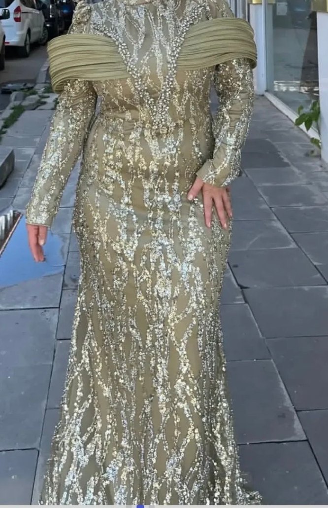 Parlak altın renkli yılan desenli uzun abiye elbise, drapeli tekne yaka ve uzun kolludur. Düzenli kesim ve modern klasik tarz sağlar, düğünler için uygundur. ✨