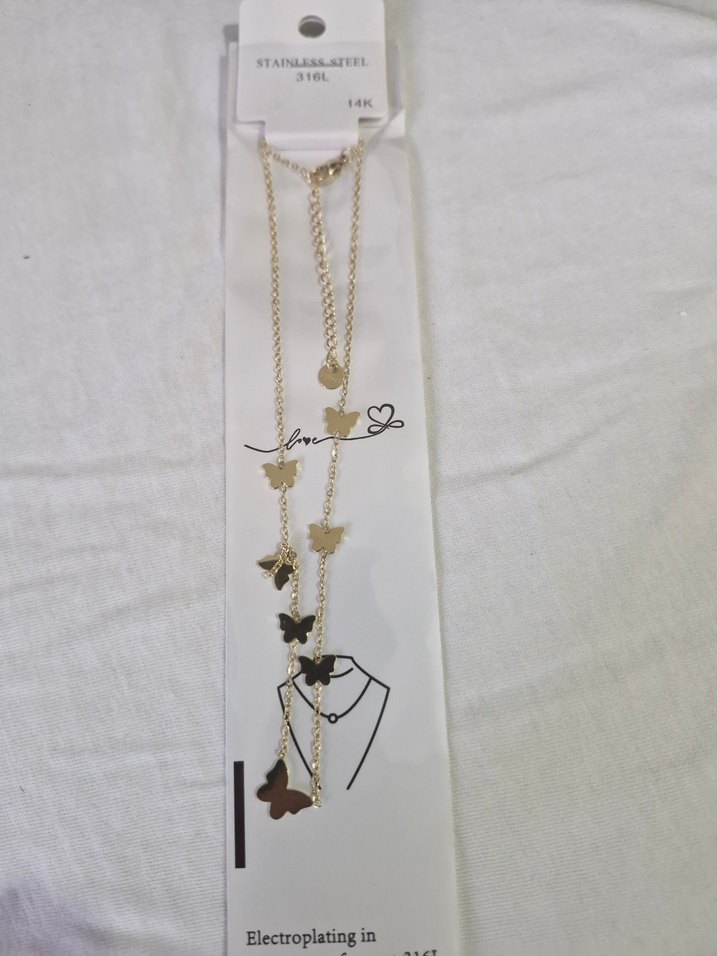 Uzun altın renkli zincir kolye, kelebek figürlü detaylara sahip, bohem ve minimalist tarzda günlük kullanım için uygun. Paslanmaz çelikten, elektro kaplama ile üretilmiştir.