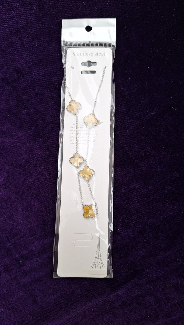 Altın renkli, uzun ve detaylı zincire sahip kadın kolyesi, hafif tonlarda yonca şeklinde süslemelerle gündelik kullanıma uygun modern Paris tarzını yansıtıyor.