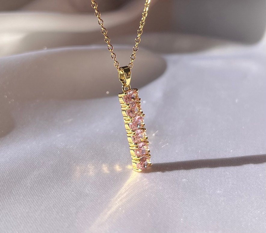 Uzun altın zincirli, yılan deseni detaylı kadın kolye, açık pembe taşlarla süslenmiştir. Cesur ve gösterişli tarz için uygundur. #zirkontaşkolye #çelikkolye