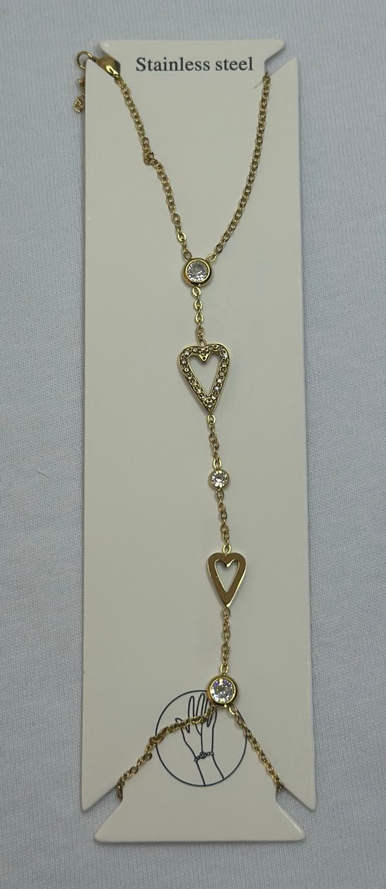 Altın renkli uzun zincir üzerinde detaylı kalp figürleri ve şeffaf taşlar bulunan kadın kolyesi, bohem tarzına uygun günlük kullanıma uygundur.