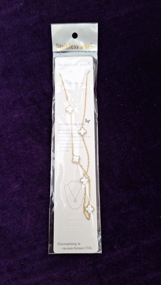 Altın renkli uzun zincirli kolye, baskılı çiçek desenlerine sahiptir. Vakum fırında elektrolaplama ile hafif ve çağdaş bir görünüm sunar.