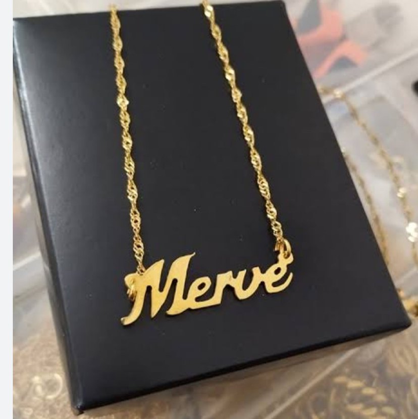 Altın renkli, detaylı zincirli ve "Merve" yazılı uzun kolye, minimal tarz için uygundur. ✨