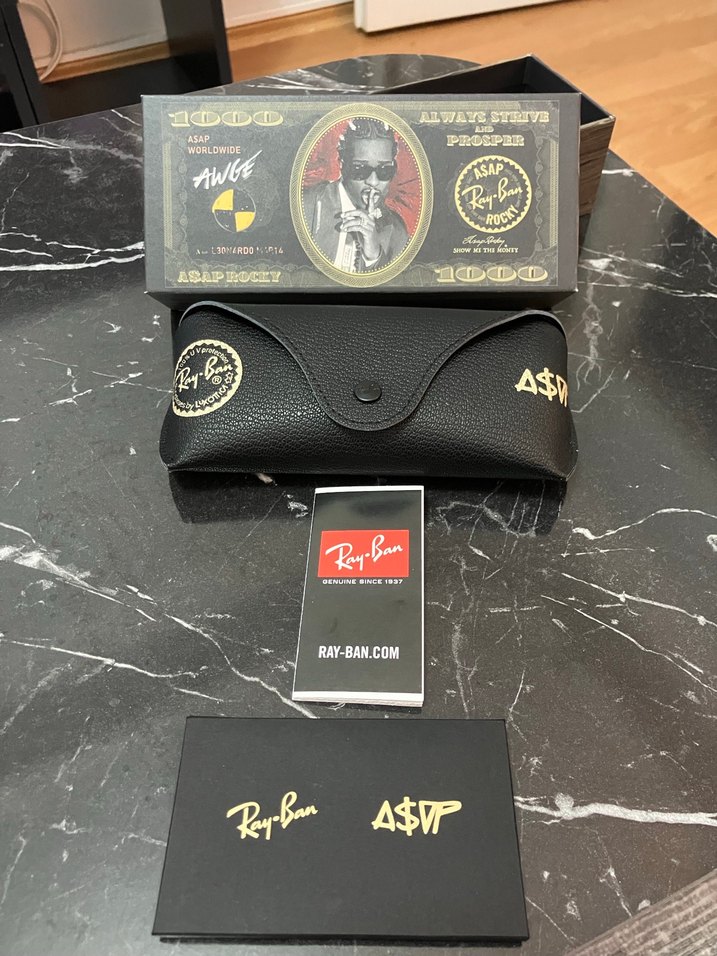 Altın renkli Ray-Ban gözlük kutusu, Velcro kapama ve A$VP logosu ile klasik ve avangart tarzı bir araya getiriyor. ️