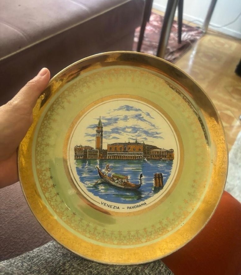 Parlak altın renkli, baskılı Venedik panoraması ve gondol figürlü klasik tarzda tabak. Mavi su ve gökyüzü detayları dikkat çeker.