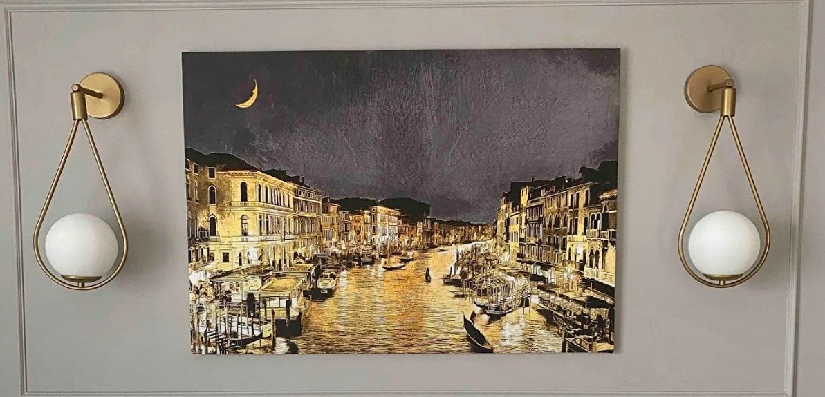 Altın Renkli Venedik Gece Şehir Manzarası Tablosu - Görsel 2