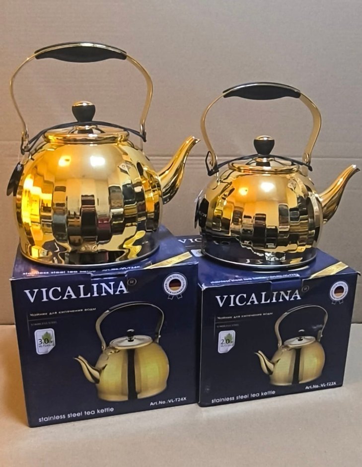 Vicalina markalı, altın renkli paslanmaz çelik çaydanlıklar, parlak yüzey ve kullanışlı saplara sahip. İki farklı boy seçeneği bulunur. ☕️