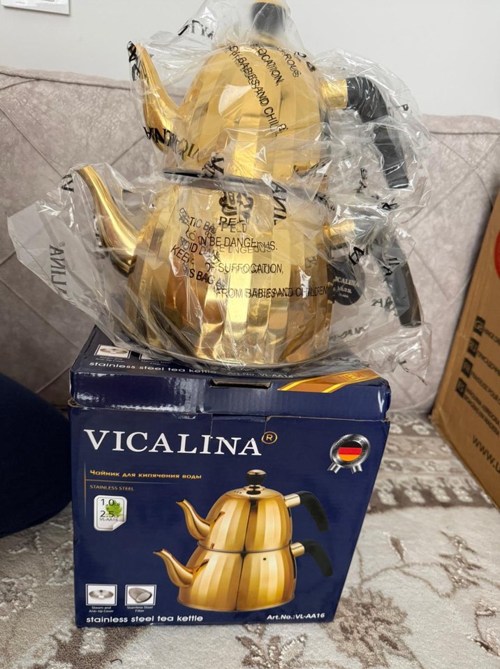Vicalina markalı altın renkli, koyu parlak paslanmaz çelikten üretilmiş çaydanlık seti. ☕