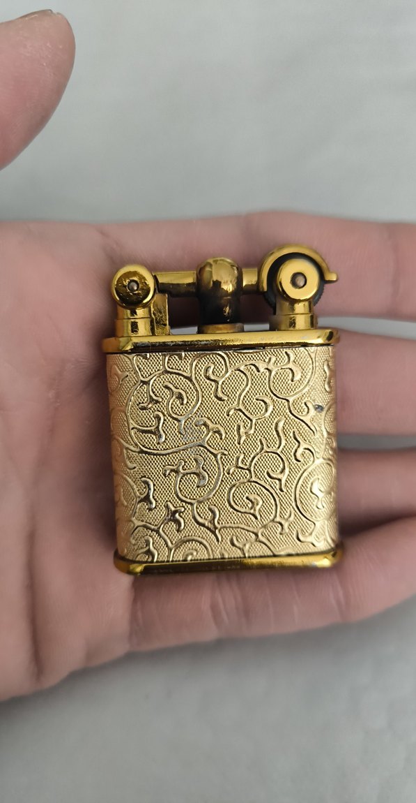 El boyu büyüklüğünde, detaylı desenlere sahip altın renkli vintage çakmak. Klasik görünümüyle koleksiyonluk hediye seçeneği.