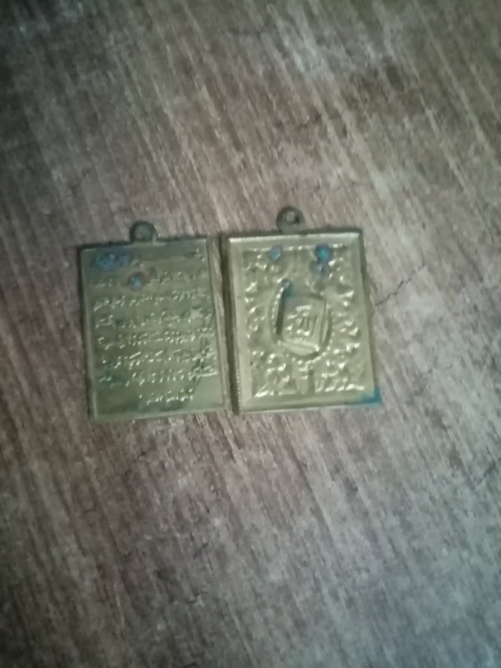 Parlak altın renkte, iki tarafında detaylı oyma desenler bulunan vintage erkek rozeti. Küçük bir asma halkası mevcuttur.