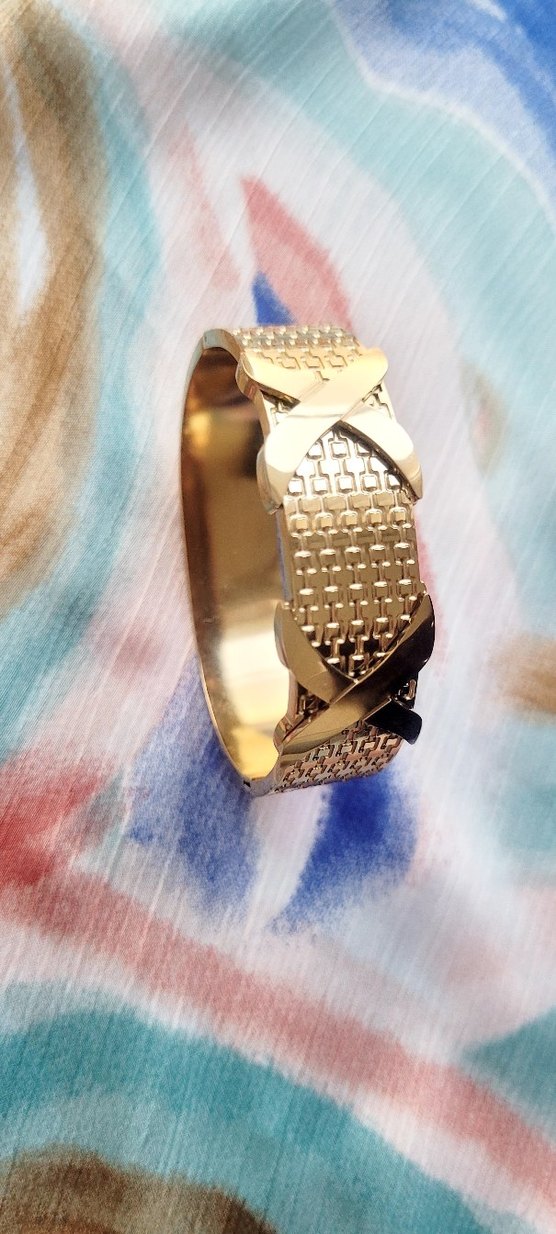 Vintage ve çağdaş tarzları harmanlayan, parlak yüzeyli, kemer detaylı altın renkli kadın bileklik, düğün için uygundur. ✨316L çeliktir.