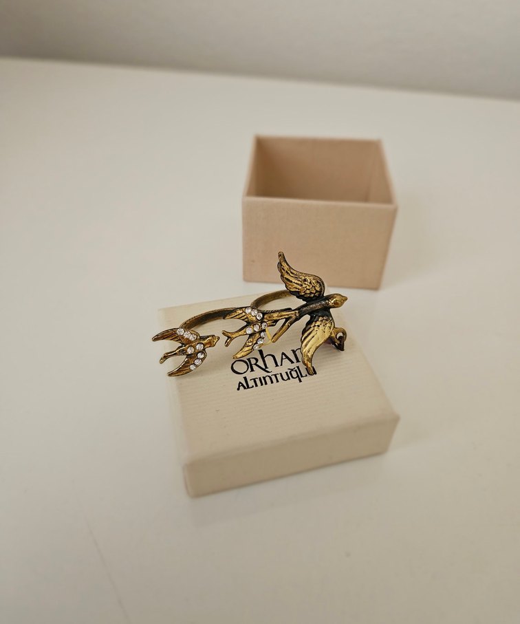Parlak altın renkli bu yüzük, vintage bohem tarzda kuş figürleri taşır.