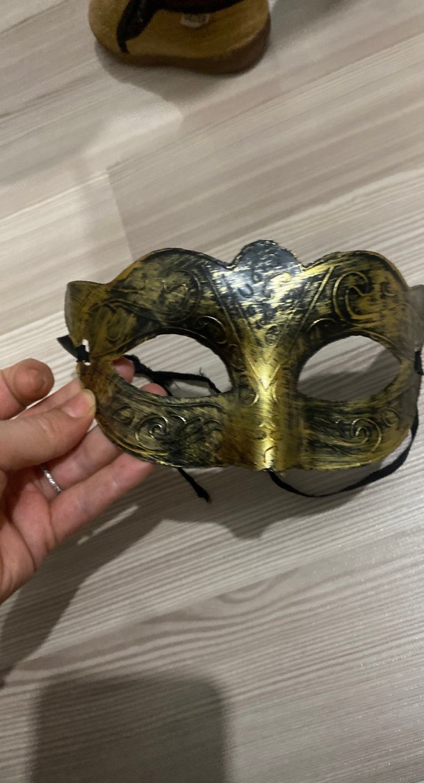 Antik altın renginde, göz ve yüzü kısmen kapatan detaylı desenli vintage tarzda maske. Bağlama ipi ile sabitlenir.
