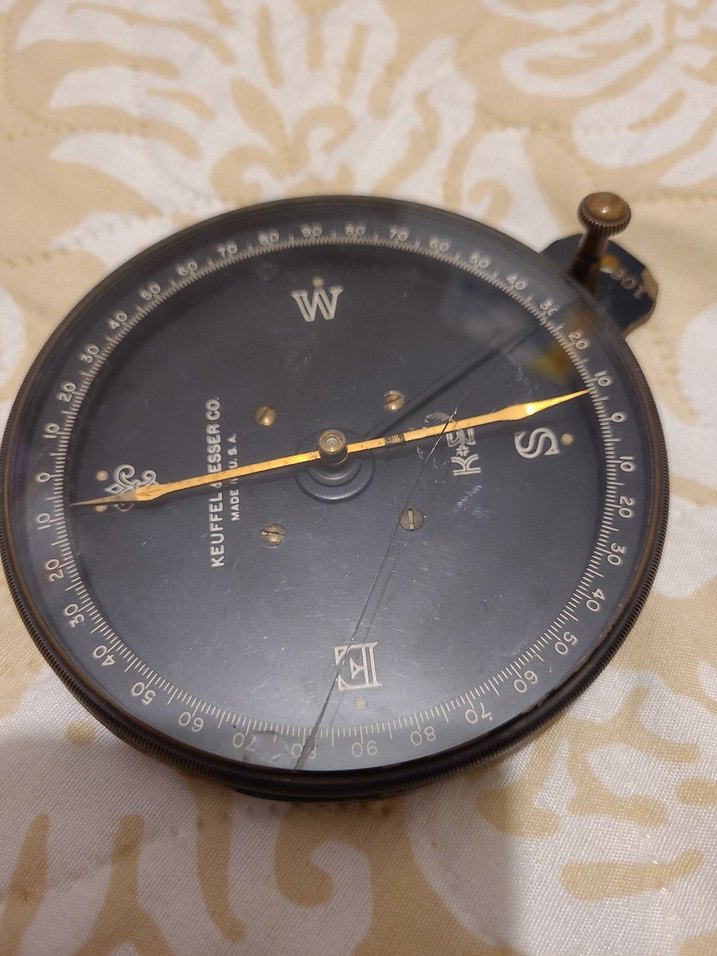Koyu yüzeyli, altın detaylı vintage pusula. Üzerinde 'S' ve 'W' harfleri ve ayar düğmesi bulunur. Yuvarlak klasik tasarım. 1930'lu yıllardan askeri pusula. Nadir bulunan bir alet