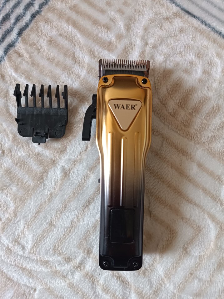WAER marka, parlak altın renkli saç kesme makinesi, ayarlanabilir siyah tarak aparatıyla birlikte gelir. ✂️