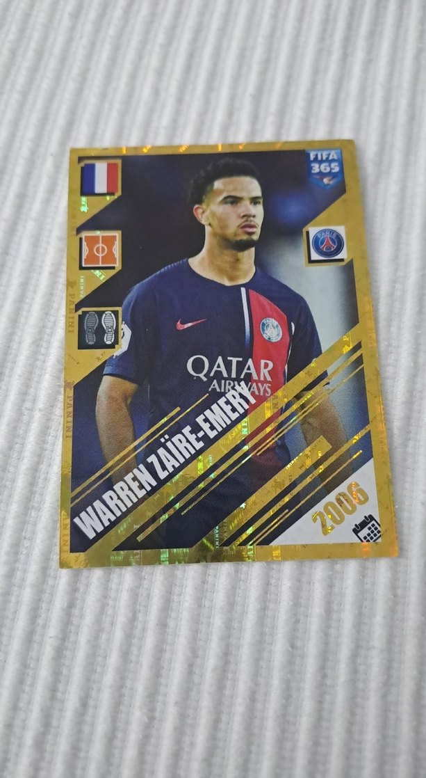 Paris Saint-Germain forması giymiş Warren Zaire-Emery'in yer aldığı, FIFA 365 ve Qatar Airways logolu altın renkli rozet. Oyuncu detayları ve ikonlar mevcut. ⚽