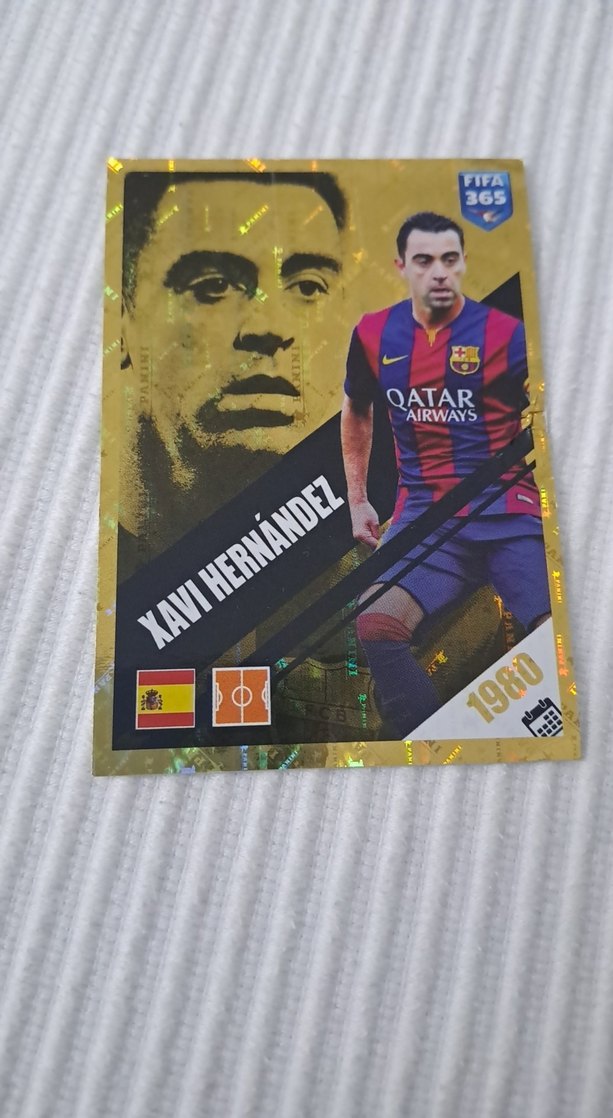 Altın renkli futbol kartı, Xavi Hernández'in Barcelona formasıyla yer aldığı, Katar Airways sponsorlu. İspanya bayrağı ve futbol simgeleri içerir. FIFA 365 markalı. ⚽