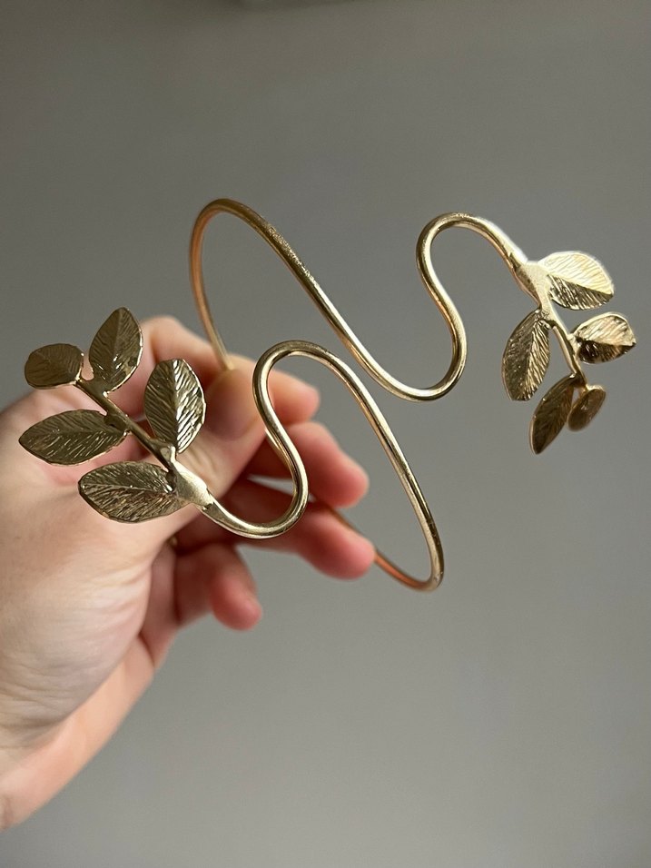 Parlak altın renkli, yaprak detaylı ve yılan desenli elastik bileklik, günlük kullanıma uygundur.