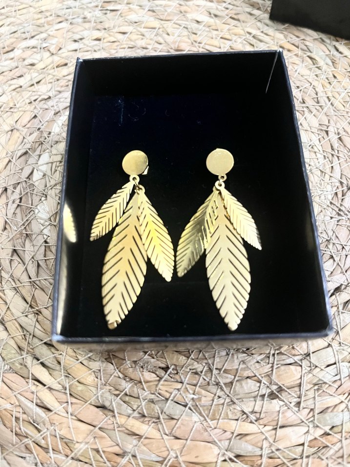 Parlak altın renkli, yaprak küpeler. Bohem tarz için uygun, romantik akşamlar için ideal. ✨