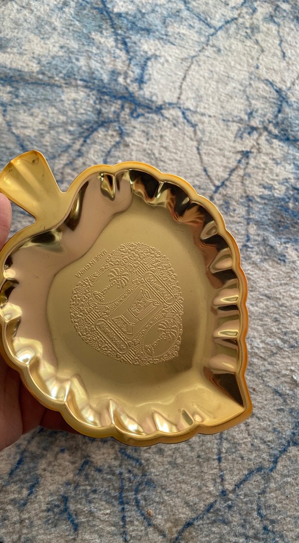 Parlak altın renkli, yaprak şeklinde, ortasında baskılı desen bulunan klasik tarzda bir tabak. ️