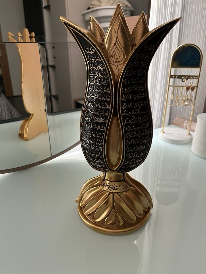 Koyu altın renginde, yazılı detaylara sahip lale şeklinde biblo. Dekoratif taban üzerinde durur, geleneksel tasarımla şıklığı birleştirir.