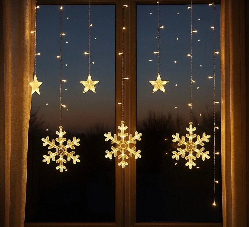 Altın renkli, yıldız ve kar tanesi şeklinde asılan ışıklarla yeni yıl atmosferi yaratan süslemeler. ✨