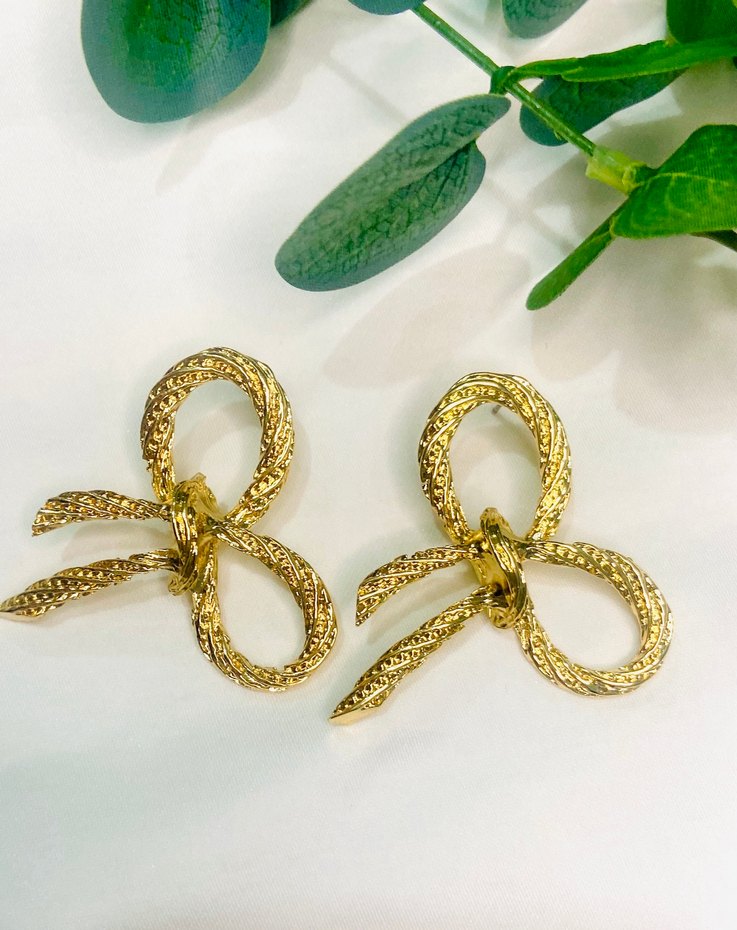 Altın renginde, yılan derisi dokusuyla fiyonk şeklinde tasarlanmış midi uzunlukta küpeler. Klasik zarafet ve bohem stil birleşimi, düğünler için uygun. ✨