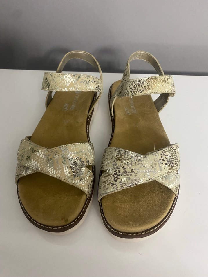 Altın renkli, parlak yılan desenli kadın sandaletidir. Dolgu topuklu ve tokalı kayışlıdır, rahat kauçuk tabana sahiptir.