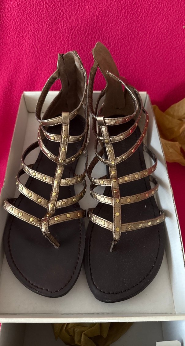 Altın renkli deri, yılan desenli, tokalı bantlara sahip dolgu topuklu kadın sandalet. Günlük kullanım için bohem tarzda.