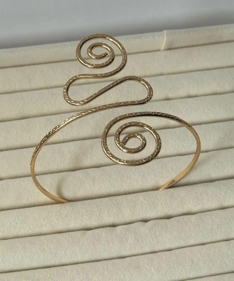 Yılan deseni ve elastik yapıya sahip, parlak altın renkli bilezik. Bohem ve minimal stillerle uyumlu, düğünler için uygun.