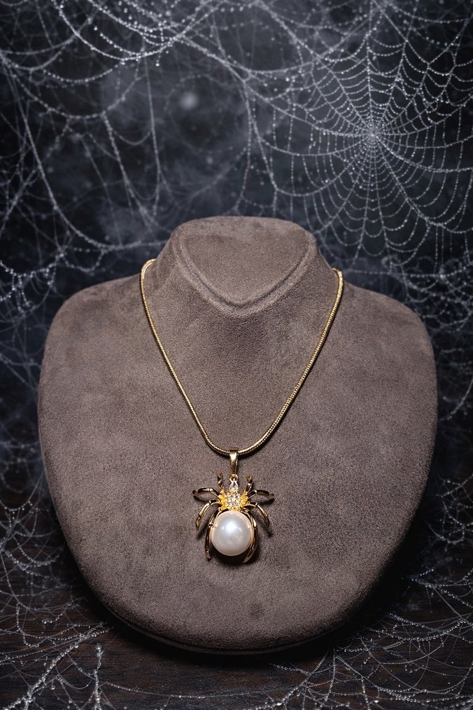 Parlak altın renkli, yılan desenli gotik tarzda, inci detaylı boncuklu örümcek kolye. Midi uzunlukta, romantik akşamlar için uygun.