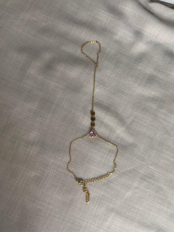 Bohem tarzda, altın renkli ince zincir ve yılan deseni detaylı, pembe taşlı kadın el zinciri. Düğünler için uygun.