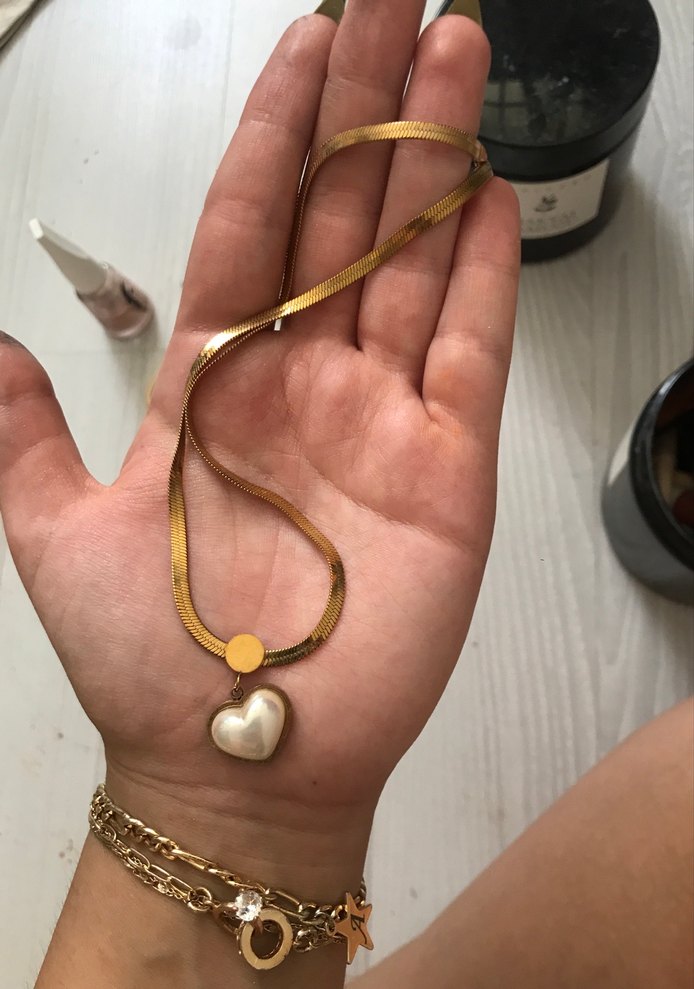 Altın renkli yılan desenli zincir ve kalp şeklinde ucu olan midi uzunlukta kolye. Günlük sokak modasına uygun, Paris tarzı avant-garde dokunuşlu.