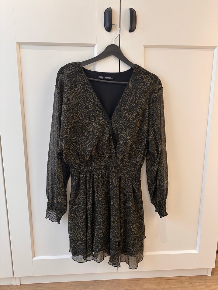 Uzun kollu, V yaka ve yılan desenli altın renkli, bol kesim mini elbise. Drapeli tasarımı ile günlük sokak stili için uygun.