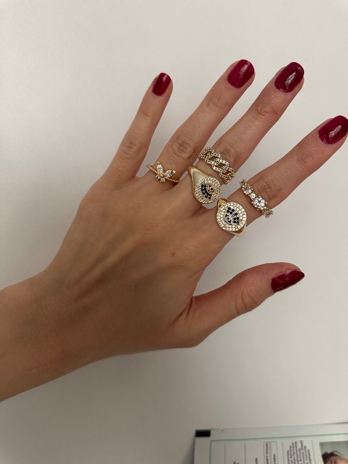 Altın renkli, yılan desenli ve payetli kadın yüzük, bohem ve retro tarzıyla günlük kullanıma uygun. Adet fiyatı 100₺