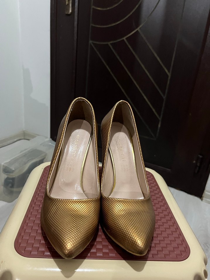 Altın renkli, yılan desenli ve pileli detaylı kadın stiletto. Klasik stilettosu ve kauçuk malzemesi ile günlük şıklık sunar.